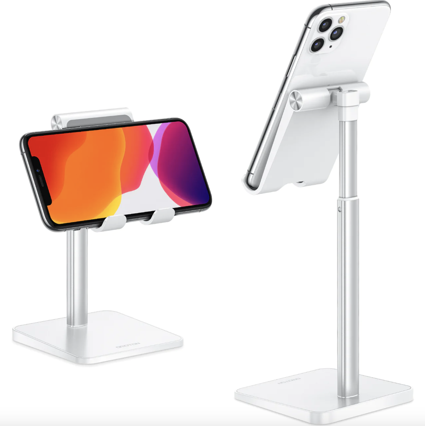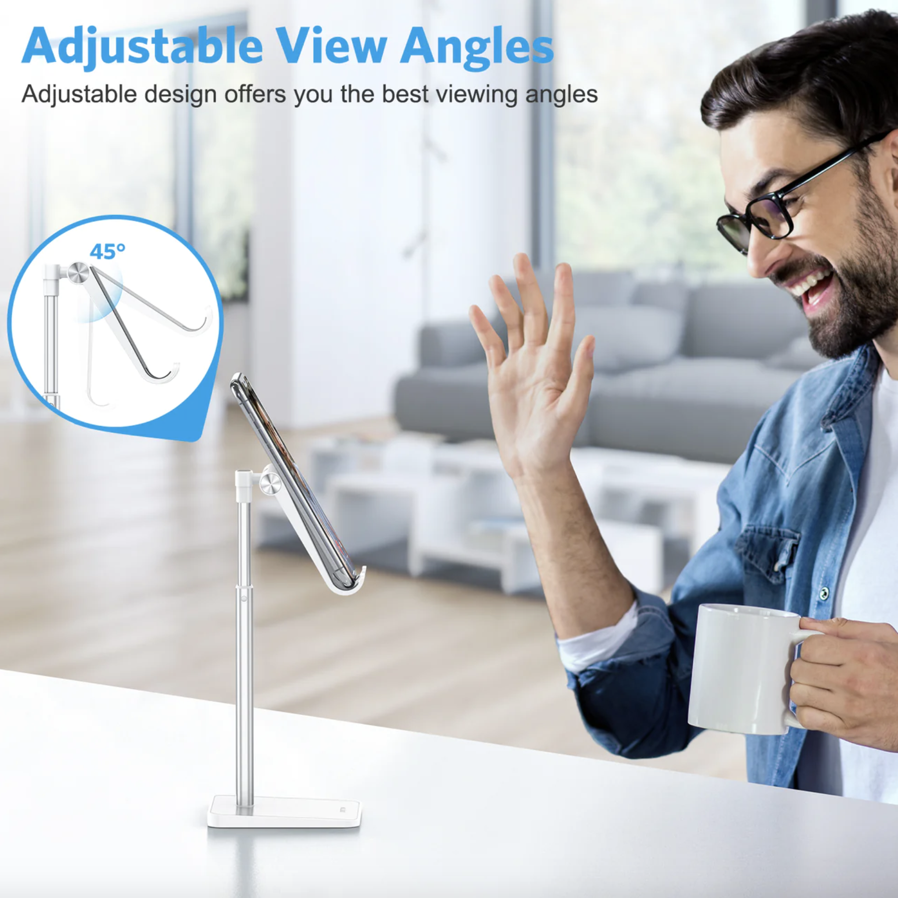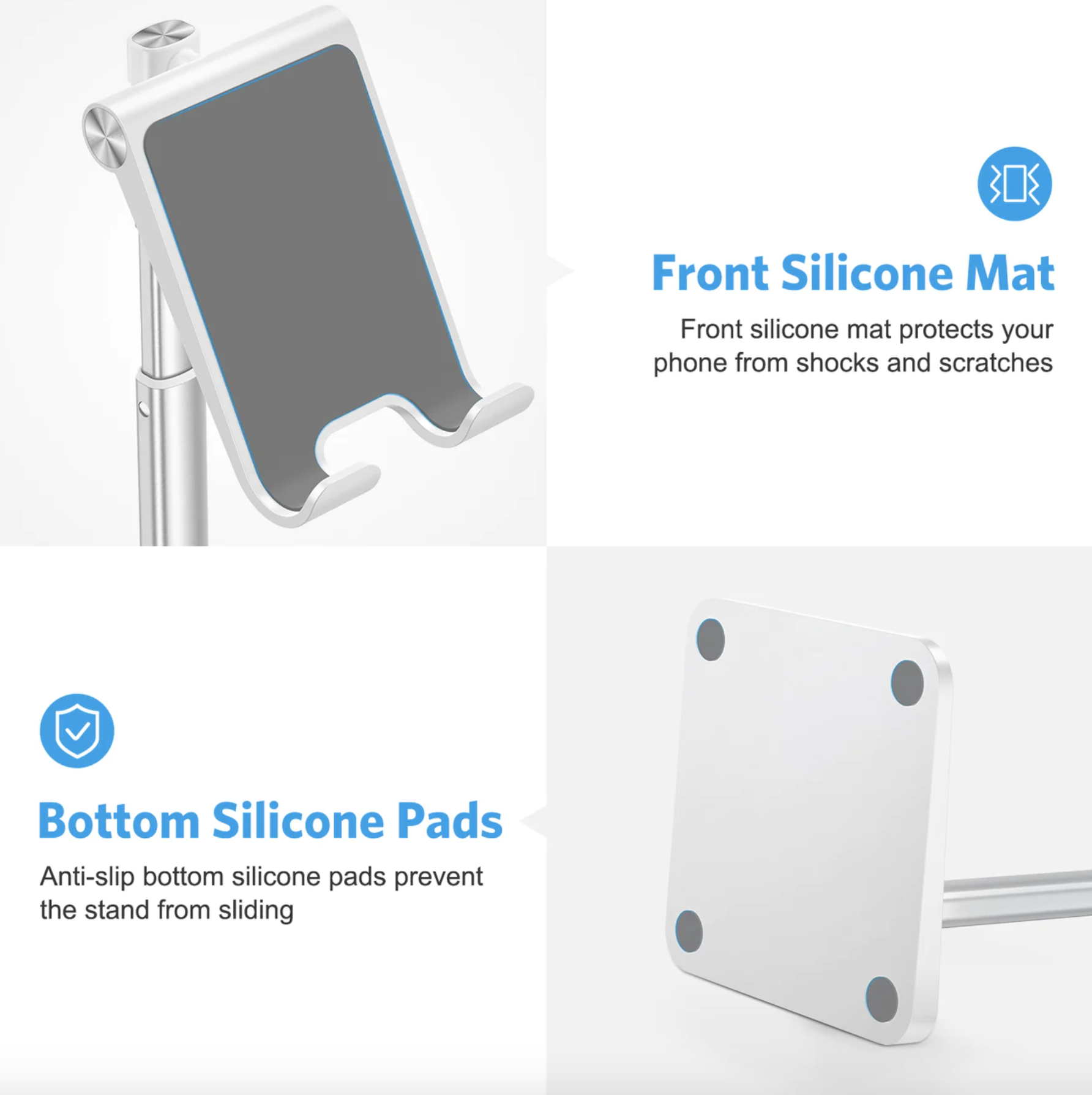 • Verstärkte Anti-Rutsch-Basis. Der Telefonständer verfügt über eine verstärkte, stabile Basis, einen Stab aus Aluminiumlegierung und eine rutschfeste Silikonunterlage, um Ihre Geräte sicher an Ort und Stelle zu halten.