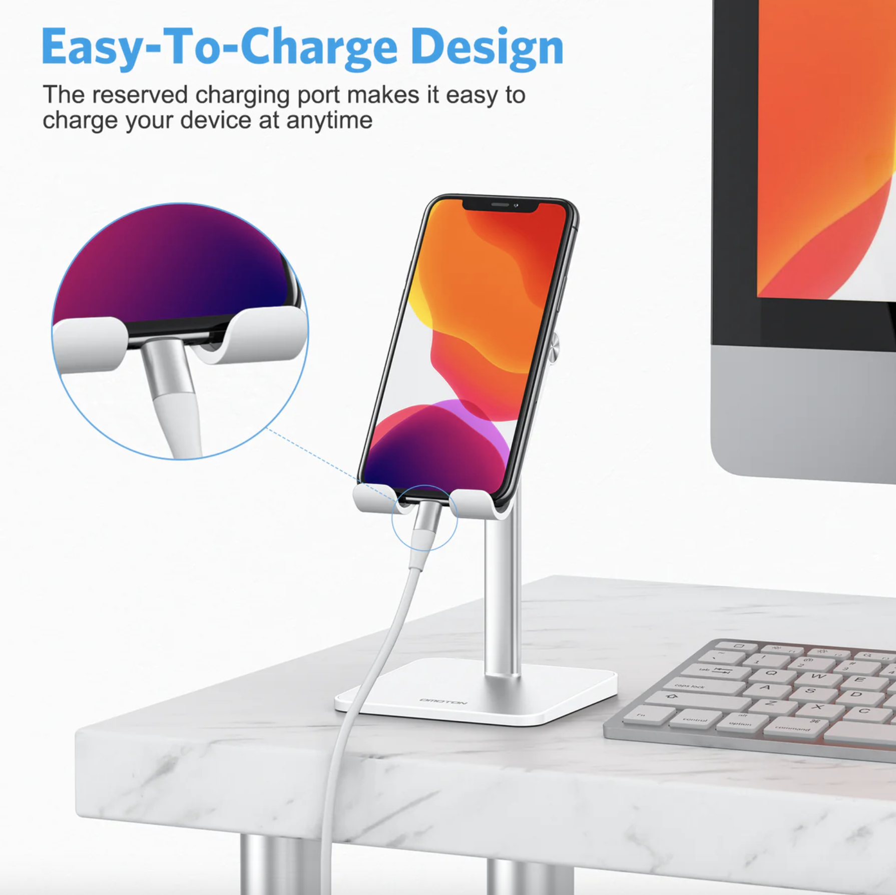 • Einstellbare Höhe und Winkel. Mit einem flexiblen Höhenbereich von 6,29 bis 8,29 Zoll und einem Neigungsbereich von bis zu 45 Grad bietet der Telefonständer den perfekten Betrachtungswinkel zum Spielen, Ansehen von Videos oder Facetime-Anrufen. Es hilft, die Nackenbelastung zu reduzieren und sorgt für ein angenehmes Arbeits- und Unterhaltungserlebnis.